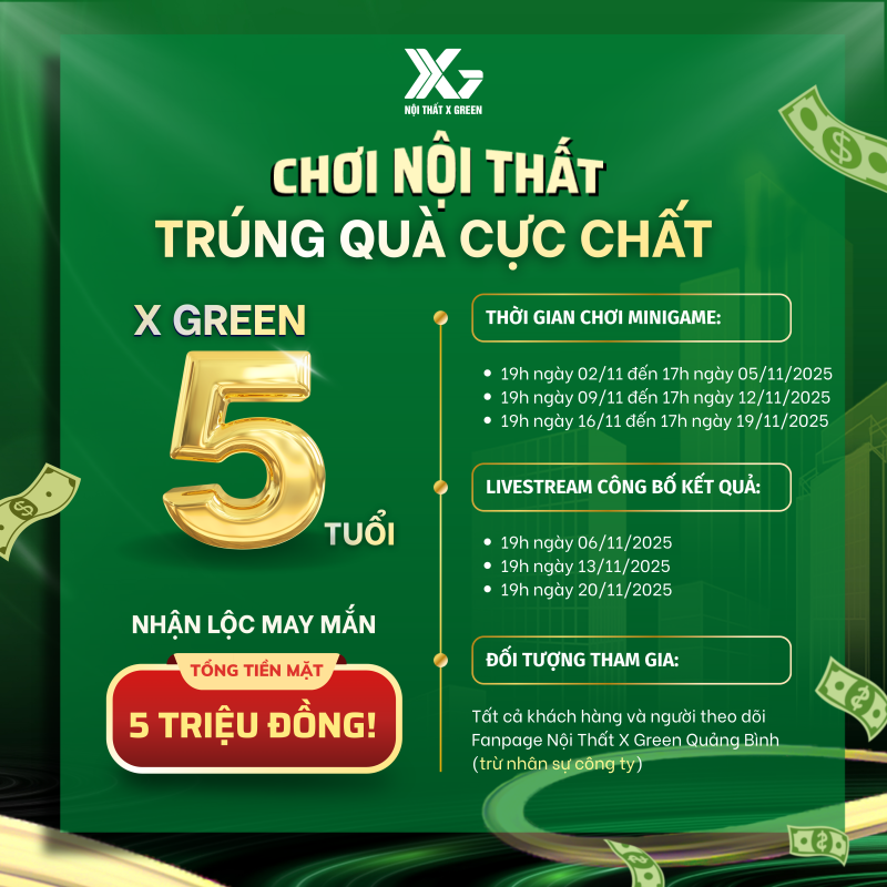 Đối tượng tham gia: Tất cả khách hàng và người theo dõi fanpage Nội thất X Green Quảng Bình (trừ nhân sự công ty)